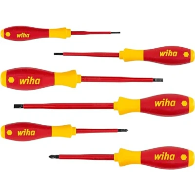 Increases your efficiency : Unique Wiha handle-length concept for optimum balance of torque and control. Protects your health : With the patented SoftFinish® handle design, ensuring work is kind to hands and muscles. Recommended by doctors and therapists at German Campaign for Healthier Backs. Offers you full protection : Each tool individually tested at 10,000 V AC and approved for 1,000 V AC. Application : For work in the area of live parts up to 1,000 V AC. Handle : Ergonomic Wiha SoftFinish® multi-component handle with roll-off protection. Blade : High quality chrome-vanadium-molybdenum steel, through hardened, black-finish. Blade : Insulation moulded directly onto blade. Electrics Manufactured acc. to IEC 60900. Content: 1x Screwdriver SoftFinish® electric Slotted 2.5 mm x 75 mm (00820) 1x Screwdriver SoftFinish® electric Slotted 3.5 mm x 100 mm (00822) 1x Screwdriver SoftFinish® electric Slotted 4.5 mm x 125 mm (00824) 1x Screwdriver SoftFinish® electric Slotted 5.5 mm x 125 mm