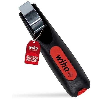 PRECISION: Stripping of standard round cables with a 4 mm - 28 mm diameter. The cutting depth is infinitely adjustable OPTIMAL: The electrician's tool includes a self-turning inner blade that automatically adjusts from round to longitudinal cut SAFETY: The self-tensioning retaining clip of the stripping tool ensures safe cable guidance and serves as a cover for the blade DESIGN: With its large handle diameter, the stripping tool lies perfectly in your hand yet is especially compact and space-saving CLEVERLY CONCEIVED: The handle of the universal stripping tool contains an additional spare blade Electricians need to trim and skin cables often when installing electrical systems. Their equipment would be incomplete without a stripping tool. The stripping tool from Wiha guarantees precise, fast, and safe stripping. The infinitely variable, adjustable cutting depth using an adjusting screw enables convenient stripping of all common round cable diameters from 4 mm - 28 mm. The tool