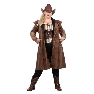 The women's coat in size 48 is made from a suede-like fabric that provides an elegant yet robust look The lapel and collar are made from a supple black fabric The short cape of the coat is reminiscent of shoulder caps and is decorated with decorative conchos It is equipped with functional pockets that are also decorated with conchos and can be closed with three wood-like buttons Non-iron fabric that is washable at 30 °C, Manufacturer: Wilbers Karnaval B.V.