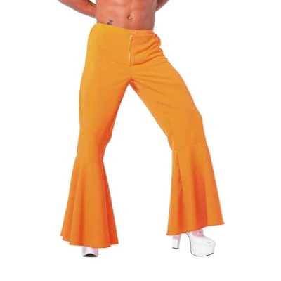 Striking retro look: flared hippie trousers in 70s style - perfect for carnival, theme parties or festivals Orange color: the soft, flowing fabric is comfortable to wear Size 50: Elastic waistband and comfortable cut - the trousers sit comfortably and fall from the knee into a flared leg Practical closure: easy to put on and take off thanks to the front zip and button Easy care and practical: washable at 30 °C and non-iron