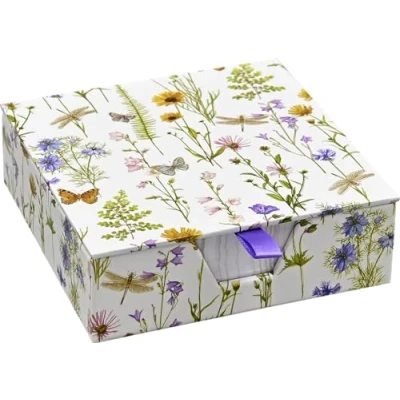 Jot down notes, reminders, spur-of-the-moment ideas, and more on these pretty memo sheets. Our beautiful keepsake box keeps them right at your fingertips! Desk Notes set contains 250 note sheets. Keepsake box design features softly hued butterflies, dragonflies, ferns, and flowers, embellished with shimmering gold foil highlights. A matching satin ribbon tab adds a touch of elegance. The magnetic closure secures your note set with a soft ''click.'' Design motif is replicated in full color at the bottom of each note sheet. Desk Notes set complements home and office work spaces.