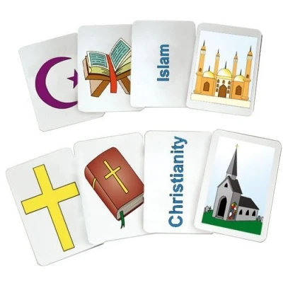 A set of 36 colourful laminated cards Showing places of worship, sacred texts, religious symbols and names of the six major world faiths A fun game to introduce pupils to religion