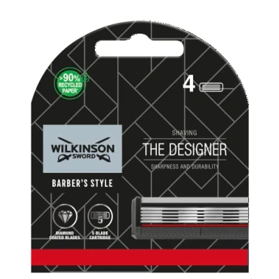 Wilkinson Sword Barber's Style The Designer delivers outstanding precision for an easily controlled shave Diamond coated blades for sharpness and durability Lubrication before and after blades to reduce irritation during shave 5 blade cartridge perfectly spaced for extraordinary shaving comfort & easy rinse through Contour trimmer on the reverse of the blade head so you can easily reach tricky areas Paper Packaging made with more than 90% recycled content. Packaging is recyclable, please check your local recycling facilities.