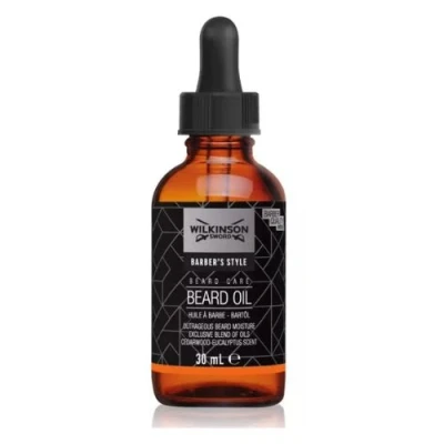 Experience the luxury of a barbershop at home with Wilkinson Sword Barber's Beard Oil. Our unique formula of natural oils softens stubble, revitalizes and hydrates all beard lengths. Made with argan, jojoba, and avocado oils to prevent dryness and itchiness. Enjoy the earthy aroma of Cedar and sharp tones of Eucalyptus.. 1 x Wilkinson Sword Barber's Beard Oil 30ml. Argan, jojoba and avocado oils. Prevents dryness and itchiness
