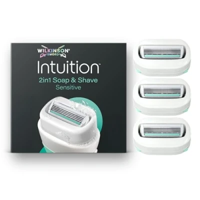 SOAP AND SHAVE IN ONE: Sensitive skin razors for women with four blades surrounded by built-in vegan solid soap; everything you need in one effortless glide, no more juggling shave gel GRIPPY HANDLE: Easy-grip rubber handle gives you confident control even in steamy shower situations; your women's razor stays put, no mid-shave slips SOFT SKIN, SORTED: Soap with a touch of Aloe Vera lathers during every shave, so they’re great as a legs, pits or body razor; 2in1 shaving razors are dermatologically tested and suitable for sensitive skin JUST ADD WATER: Soap and shave in one step with no need for shave gel; these razors for sensitive skin hug your body perfectly as your everyday shaving razor for women REFILL PACK: Includes three Intuition 2in1 Sensitive razor blade refills; refills are compatible with all Intuition 2in1 Soap and Shave women's razor handles
