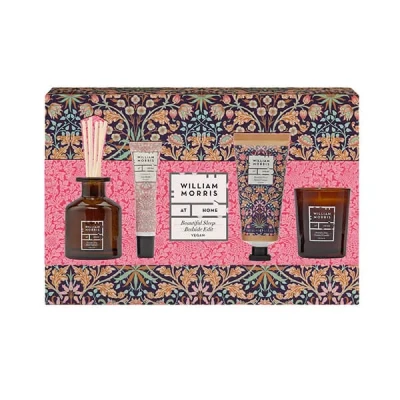This William Morris At Home Beautiful Sleep Bedside Edit contains a 60ml diffuser, 70g votive candle, 50ml hand cream and a 10ml vitamin E lip balm.These bedside table essentials are presented in a decorated drawer style box and makes the perfect gift for a loved one.The diffuser and votive candle help to prepare the bedroom for relaxation. The 50ml hand cream contains sweet almond oil, hydrating hyaluronic acid and lavender extracts. Finally the fragrance free vitamin E lip balm keeps the lips from drying during the night.Recyclable glass, Kraft paper tube reducing plastic content and PCR plastic tube. Cruelty free and vegan friendly.