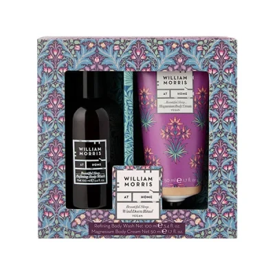 This William Morris At Home Beautiful Sleep Wind Down Ritual Set contains a 100ml refining body wash and a 50ml magnesium body cream.Infused with science-backed fragrances proven to enhance sleep with a blend of lavender, cedarwood, coriander and vetiver essential oils.the body wash is formulated with lavender, glycerin and gentle exfoliators. The body cream is blended with hydrating hyaluronic acid, antioxidant vitamin E and wonder mineral magnesium.Sustainably packaged duo using kraft paper tube made with 30% less plastic and 100% PCR bottle. Cruelty free and vegan friendly.