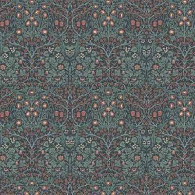 WallpaperDirectOriginally block-printed, and showcasing white sloe blossoms, violets, red snake’s head fritillaries, and yellow daisies, all blooming from a lattice of curling foliage in this classic Morris pattern. Seen here in the Navy colourway.