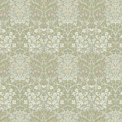 WallpaperDirectOriginally block-printed, and showcasing white sloe blossoms, violets, red snake’s head fritillaries, and yellow daisies, all blooming from a lattice of curling foliage in this classic Morris pattern. Seen here in the Sage colourway.