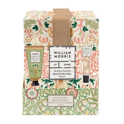 The William Morris At Home Kitchen Garden Back Pocket Duo pairs everyday practicality with iconic arts-and-crafts design. This compact pouch, decorated in an authentic William Morris Flowerpot print, holds a Sunlit Tomato Hand Repair Cream (30ml) and a vitamin E lip balm (10ml)—ideal for keeping hands and lips nourished while you're out and about. A built‑in strap with a secure popper allows the pouch to attach easily to any belt, creating a convenient “extra pocket” for travel, gardening, or daily errands.The Sunlit Tomato Hand Repair Cream is formulated with odour‑neutralising technology for fresh-feeling hands after cooking. Lycopene from ripe tomatoes provides antioxidant care and lends the cream its soft rosy tint. A blend of prebiotic chicory root extract, shea butter and macadamia oil helps restore moisture, leaving skin smooth and lightly scented with notes of tomato leaf, green stems, lime, moss and a hint of vanilla.The set also includes a fragrance‑free lip balm enriched with cherry extract to condition and protect lips whenever needed.Created in collaboration with the not‑for‑profit William Morris Gallery, each purchase supports their work in preserving the legacy of the celebrated designer. The duo is cruelty free and vegan friendly.