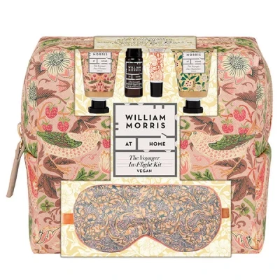 Meet The Voyager In Flight Kit from William Morris At Home — a thoughtfully curated travel companion designed to bring comfort and calm to every journey. Housed in a beautifully crafted Strawberry Thief print wash bag, this set gathers five self‑care essentials sized for life in the air: a gentle 30ml face cleanser, hydrating 30ml face moisturiser, refreshing 15ml body & space mist, nourishing 10ml lip balm, and a soft velvet eye mask in the elegant Batchelor’s Button print.Each formula is infused with Iceland 1871, a bright, balancing fragrance inspired by William Morris’s travels to the Nordic landscape. Notes of bergamot, orange blossom, patchouli and soft leather create a clean, grounding scent that feels restorative on the go.Developed with skin-kind ingredients, the cleanser, moisturiser and lip balm feature vitamin E plus bergamot and sweet orange essential oils to hydrate, soothe and protect during long flights. The Body & Space Mist revives your senses mid‑journey, while the plush eye mask supports much‑needed rest.Created in partnership with the not‑for‑profit William Morris Gallery, every purchase helps preserve the legacy of this iconic artist for future generations. Cruelty‑free and vegan friendly.