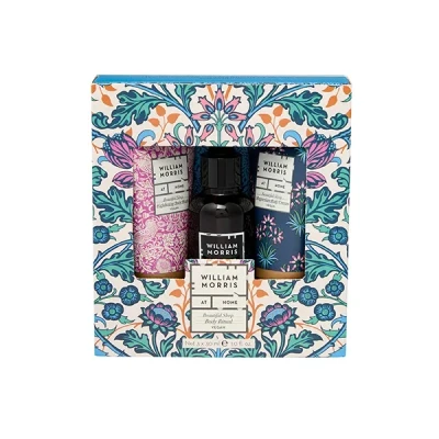 The William Morris Beautiful Sleep Body Ritual gift box set contains a 30ml body wash, 30ml body oil and a 30ml body cream.Ideal for your night time getting ready for bed ritual, this set is made with a blend of lavender, cedarwood, coriander and vetiver. These oils are all known for their soothing and calming properties along with magnesium for relaxation and restful sleep.The collection includes a Cleansing Body Wash infused with lavender and moisturizing glycerin for a soothing experience, a luxurious Body Oil enriched with nourishing sweet almond and jojoba oils for dry skin areas, and a Magnesium Body Cream featuring the super-hydrating properties of hyaluronic acid and the antioxidant benefits of vitamin E to promote relaxation.Sustainably packaged in kraft paper tubes using 30% less plastic, recyclable glass. Cruelty free and vegan friendly.