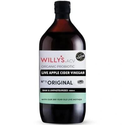 WILLY'S Apple Cider Vinegar with Live Mother Probiotics For Detox & Gut Health 1L Glass Bottle Sustainable ACV (Packaging may vary)