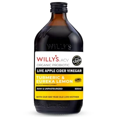 APPLE CIDER VINEGAR: Willy's ACV with live mother is organic, raw, unpasteurised, unfiltered & naturally fermented to support gut health. Made using 48 wild apple varieties from our 300-year-old Herefordshire orchard for a high concentration of beneficial bacteria. TURMERIC, LEMON & BLACK PEPPER: Infused with turmeric, a powerful anti-inflammatory & antioxidant, combined with black pepper to enhance curcumin absorption. This unique blend is designed to support digestion & immune health while adding a delicious natural zest. HONEY FOR ADDED BENEFITS: Our organic honey is rich in antioxidants & has natural antimicrobial properties. It enhances the taste while providing added health benefits. A perfect natural sweetener to balance the tangy ACV flavour, making it easy to incorporate into daily routines. VEGETARIAN & GLUTEN FREE: This apple cider vinegar is vegetarian, gluten-free & non-GMO. It contains no artificial additives or preservatives, making it the perfect choice for those seeking a pure, sustainable & ethical wellness product to support gut health & digestion. VERSATILE DAILY USE: Take a 15ml shot diluted in water, use in salad dressings, marinades, soups or as a natural tonic. Great as a caffeine-free morning boost or salt replacement. Try it in skincare routines as a natural facial steam for a refreshing, glowing complexion.