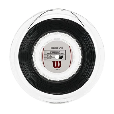 Wilson tennis racket string for stringing rackets, Ideal for aggressive players with lots of stroke spin Good spin due to pentagonal string shape Improved sensation and reduced tension loss due to polymer ester material Roll with 200 metres for about 15 - 16 restringings, Monofilament string Contents: Wilson Tennis Racket String, Revolve, Length: 200 Metres, Diameter: 1.25 mm, Material: Co-Polyester, Colour: Black, WRZ908100