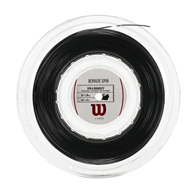 Wilson tennis racket string for stringing rackets, Ideal for aggressive players with lots of stroke spin Good spin due to pentagonal string shape Improved sensation and reduced tension loss due to polymer ester material Roll with 200 metres for about 15 - 16 restringings, Monofilament string Contents: Wilson Tennis Racket String, Revolve, Length: 200 Metres, Diameter: 1.30 mm, Material: Co-Polyester, Colour: Black, WRZ907600