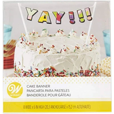 AmazonColorful banner for birthday cakes spells out "Yay!!!" Color: Assorted Material: Paper and plastic 8 x 6 in. (20.3 x 15.2 cm) Do not use near candles or open flame