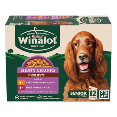 WINALOT Senior Wet Dog Food Mixed in Gravy with Chicken & Beef 4 x 12 x 100g Pouches Pack Includes: 24 x Chicken with Carrots; 24 x Beef with Potatoes Easy to serve, no mess pouch Each pouch is a tasty meal, full of goodness - specially made for your furry family member Wet Senior Food Pouches that contain succulent (grain-free) chunks made with high quality natural ingredients Specially formulated for Senior Dogs (7+ years) Senior Dog Food developed by PURINA Pet Nutrition Experts that provides 100% Complete and Balanced Nutrition These wet dog food pouches contain no added artificial colours; flavours or preservatives