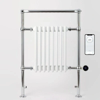 Our electric traditional column towel radiator is the perfect addition to any traditionally-styled bathroom, ensuite or cloakroom. It combines a column radiator, designed to provide ample heat to the room, with a towel warmer. Finished in white powder coating and chrome plating, it is made from steel for a tough and durable finish and secures to both the floor and wall. ✅ SMART TECHNOLOGY – Manage your heating effortlessly from your smartphone with a free downloadable app available on iOS, Android and Google operating systems. Using the latest smart technology, you can turn the heating element on or off, adjust the temperature, and set schedules and use different heating modes from anywhere using a mobile app. ✅ 7 DAY SCHEDULING – Optimise your energy use by setting time periods when you require your towel rail/radiator to be on. Multiple time periods can be selected each day. Technical Information ✅ Material: Mild Steel ✅ Finish (radiator): White RAL 9016 powder coating ✅ Finish