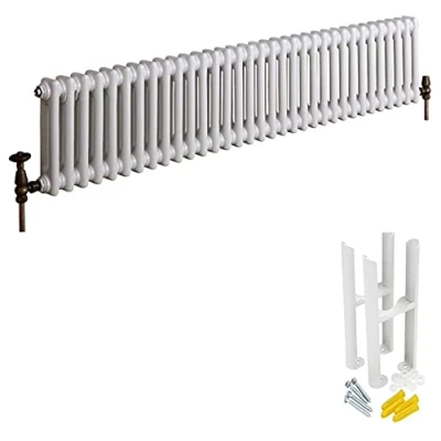 General description Bring warmth and comfort to your home with the classic style of the Milano Windsor horizontal triple column radiator. This model features a traditional cast iron inspired design and includes matching floor-mounting feet for added stability and style. Technical specifications Dimensions (HxWxD): 300mm x 1505mm x 100mm Heat output: 3963 BTUs (1161 Watts) Material: Premium quality steel Finish: White powder coated Other information Tested and certified to BS EN 442 standards Manufactured by an ISO9001:2008 registered manufacturer Supplied with blanking and bleed plug, wall fixings, and wall plugs Assured for 20 years for strength and durability