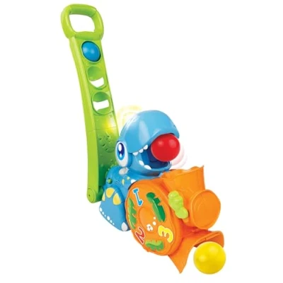 As the Dino gets pushed along, a ball pops out of a hole in the top of the push-along and as the dino opens its mouth, it catches the ball. Comes with three colourful balls that can be stored in the front of the easy grip handle. The Dino features moving legs, a spinning roller, a flashing horn, fun sounds and melodies. Suits ages 12 months +. Requires 2 x AAA batteries, supplied.