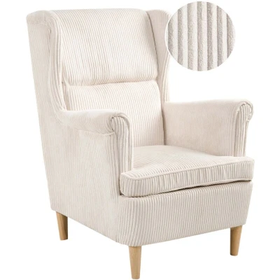 Upholstered Retro Armchair with High Backrest. Always in style, this elegant armchair effortlessly complements any interior. Upholstered in soft corduroy, it offers a warm, inviting feel while remaining durable and easy to maintain. Designed in a classic wingback shape with a generously padded seat, high backrest, and traditional rolled arms, it combines timeless charm with everyday comfort, creating an inviting spot to unwind in the living room or reading nook. Details: Product Type: Wingback Chair Style: Minimalist General Color: Beige, Brown Shade: Light Beige Material Type: Fabric Main Material: Corduroy Additional Material: Rubberwood Filling Material: Foam Legs material: Wood Seat Material: Fabric Material Composition: 92% Polyester Arm Style: Rolled-Panel Armrests: Yes Leg Caps/ Pads: No Pattern: Solid Reclining: No Seat Construction: Sinuous Springs Seat Foam Density: 30 kg/m3 Dimensions: Armrests Height: 66 cm Depth: 65 cm Seat Thickness: 10 cm Seat Height: 45 cm Width: 64 cm