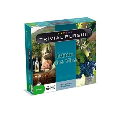 PARTY GAME: TRIVIAL PURSUIT - Wine Editions - Test your knowledge of the world of wine with this Trivial Pursuit 1800 questions of wine issue. Tray game: 6 question categories: wine geography, terroirs and grape varieties, history of wine, culture and wine, science and wine, and a "surprise" category. Includes 1 game board, 300 question and answer cards, 1 card box, 1 dice, 6 Camemberts tokens, 36 coloured triangles and game rules. Game duration: approx. 45 minutes. Game for adults: from 18 years, for 2 to 6 players., Manufacturer: WINNING MOVES