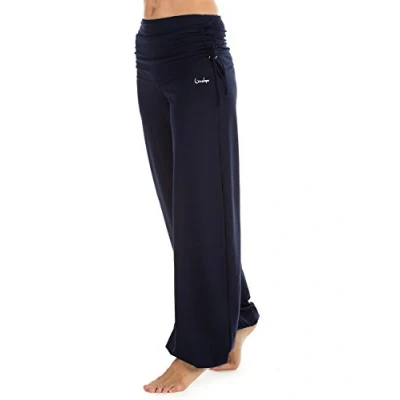 AmazonThanks to the wide, ruffled waistband, you have the possibility to wear the trousers at waist or hip height Especially suitable for yoga, pilates and body styling classes The straight cut of the trousers emphasises the figure and ensures a perfect fit and freedom of movement The length of the trousers can be adjusted thanks to an elastic band at the bottom Made in the EU