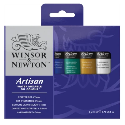 The Winsor & Newton Artisan Water Mixable Oil Starter Set is perfect for artists looking to explore the beauty of oil painting without the need for hazardous solvents. This set includes 6 essential colours in 21ml tubes, offering vibrant, versatile tones that can be thinned and cleaned with water—ideal for use at home, in schools, or shared studio spaces.. Solvent-Free Oil Painting: Enjoy the traditional look and feel of oil paints without the need for harmful solvents. These paints can be easily thinned and cleaned with water.. Vibrant, High-Quality Colours: Includes 6 rich, highly pigmented colours: Cadmium Yellow Pale Hue, Permanent Alizarin Crimson, French Ultramarine, Phthalo Green (Blue Shade), Yellow Ochre, and Titanium White. (Actual contents may vary.). Thick, Buttery Consistency: Designed for versatile application techniques, from impasto to glazing, while maintaining excellent colour vibrancy and texture.. Ideal for Shared Spaces: Perfect for artists working in shared studios, schools, or at home, offering a safe, solvent-free alternative to traditional oils.. Compatible with Artisan Mediums: Enhance your painting experience with a range of Artisan-specific thinners, oils, and mediums for added flexibility.. The Winsor & Newton Artisan Water Mixable Oil Starter Set provides a perfect introduction to solvent-free oil painting, offering vibrant colours and professional-quality performance for artists of all levels.