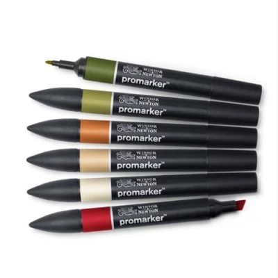 Bring your landscapes to life with the Winsor & Newton Promarker 6 Landscape Set, designed to provide rich, versatile tones perfect for outdoor scenes and earthy palettes. These professional-quality markers offer exceptional performance for artists, illustrators, and designers.. Dual-Tipped Design: Each marker features a fine bullet nib for detailed precision and a broad chisel nib for smooth coverage of larger areas.. Rich Landscape Tones: Includes six carefully selected colours to create natural, harmonious landscapes.. Seamless Blending: Alcohol-based ink ensures smooth application, vibrant coverage, and effortless layering.. Colours included:. Pesto. Herb Green. Saddle Brown. Praline. Champagne. Firebrick. Perfect for creating stunning landscape illustrations, blending earthy tones, and adding depth to your artwork, this set is an essential addition to your creative toolkit.