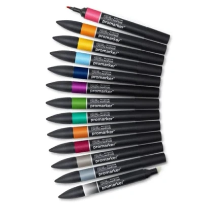 AmazonDual tips: All graphic markers have a brush tip for full coverage and a broad chisel nib for a variety of line widths Unbeatable colour: High quality alcohol based inks give incredible tonal range and vibrancy with flawless, streak-free coverage Versatile: all colors can be layered or blended and can be used on paper, acetate, glass, wood, or plastic. Ideal for All of your drawing, sketching, illustration, and craft needs Fast drying: Easily layer and mix different colors without worrying about smudges and blotches. The highly pigmented and vibrant art markers are built to last against fading Set contains: Lipstick Red, Pumpkin, Sunflower, China Blue, Indigo Blue, Plum, Forest Green, Green, Spice, Burgundy, Warm Grey 4, Ice Grey 4, Blender.