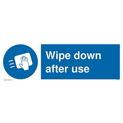 M915 : Disinfect surfaces This sign is made from vinyl high tack A stickier sticker. Uses a stronger adhesive to make it more suitable for plastic surfaces like Wheelie Bins or where the sticker might get rubbed. 31 landscape Sign Text: Wipe down after use