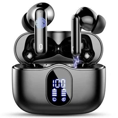 2025 Upgraded Bluetooth 5.4 and Effortless Pairing: Wireless headphones with upgraded 5.4 dual-ear synchronous transmission chip and support HFP, HSP, A2DP, AVRCP, providing you with 2X faster transfer speeds (80% higher than the previous generation) and a more stable connection. Once open the lid of charging case, headphones wireless will automatically connect to the last paired device. Hi-Fi Stereo Sound and ENC Clearer Calls: Bluetooth headphones dual 14mm low-distortion composite dynamic drivers with high resolution decoder and triple-layer composite diaphragm, deliver a captivating HD stereo sound experience. Noise cancelling Ear Buds 4 Mics and ENC algorithms that reduce noise during calls by 90%, keeping your voice sounding clear for every call. Lightweight Portable, Comfortable Fit: The Bluetooth earphones feature an ergonomic design and are made of high-quality materials that provide a firm fit that hugs the contours of your ears. Each bluetooth earbuds weighs only 3g (0.11oz), the ultra-light design allows you to wear them for a long time without feeling uncomfortable. Suitable for workout/working/reading/leisure time/travel. Dark BlackPlaytime and LED Power Display: With fast charging Type-C interface, the earphones wireless bluetooth be fully charged for only need 1.5 hours. Playtime lasts for 6-8 hours from a single charge and a total of 36 hours with the charging case. The LED display on ear buds wireless earbuds accurately display the remaining power of charging case and the charging progress of earbuds. Easy Controls and IP7 Waterproof: Through the use of ultra-light nanomaterials, the headphones wireless bluetooth reach IP7 waterproof grade, dust and rain proof, perfect for during workouts and while traveling. In ear headphones adopts high-sensitivity touch technology, which can help you easily realize multiple functions, including play/pause, answer/reject calls, volume adjustment, switch music, activate voice assistant, etc.