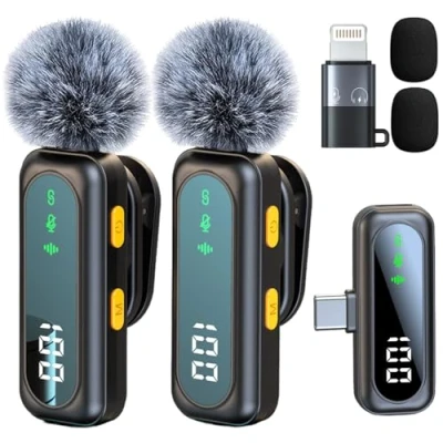 【Plug-Play Wireless Lavalier Microphone】The wireless clip-on microphone is equipped with a Lighting connector and a USB-C. Compatible with both iPhone iOS and Android smartphones and tablets, and Windows and Mac computers, it automatically pairs when turned on, no other operation is required, easy to operate,just plug in the receiver then auto connection for instant use in live streams, TikTok clips, online conferencing, recording vlog Youtube, Zoom meetings, or PC voiceovers, enjoying wireless freedom. 【Wide Compatibility】Our microphone comes with a Lightning connector, making it compatible with iPhone and Android devices. Mini microphone Suitable for iPhones, iPads, and Android devices. the microphone can be switched left and right to wear position, Suitable for various content creation scenarios such as interviews, video recording, online meetings, teaching, podcasts, vlogs, and live streaming. 【Omnidirectional HD Sound Pickup】 Fully upgraded microphone Built-in active noise reduction chip, remote radio effect is comparable to professional radio equipment, noisy environments can also be realized in high fidelity sound quality. The mini microphone with high sensitivity microphone head, our device clearly records every detail of the sound regardless of the surrounding environment. omni-directional sound reception, HI-FI high fidelity sound and distance transmission,strong endurance. 【Intelligent Noise ReductionNote】Utilizes state-of-the-art Series V 2.4GHz digital transmission and proprietary ,The wireless lavalier microphone is equipped with two plush windscreens and two replacement sponge heads. Additionally, it features a built-in active noise reduction chip that eliminates low-frequency noise while preserving high-frequency vocals, thereby producing a pure recording effect. it delivers crystal-clear, incredibly stable audio, This microphone supports all lightning port devices, such as iOS (for iPhone 6-15/ Pro/ Pro Max, etc) and almost all Android Phones and tablets.(Some Android models may require OTG enabled),You can contact me anytime if you have any questions. 【Real Time Monitoring and Compact & Travel】The mini lapel mic is equipped with a monitoring system, that is to say you can know what you are saying while making recordings. To achieve this, you can insert your digital earphones(with USB-C interface) to the port of the microphone. In this way, you can clearly know what content will be recorded by the microphone, so that you can make necessary adjustment to make your recordings more accurate, Compact & Travel, it slips into pockets or camera bags effortlessly, Great ideal for travel bloggers, field journalists, or adventurers recording in unpredictable weather.