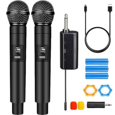 ✐ Premium DSP Chip: Microphone and receiver adopts 2.4GHz connection technology for widely used. Powered by a 24-bit DSP audio processor, this mic delivers balanced EQ, low latency, and anti-feedback for professional sound. The dual microphones and receiver adopts metal aluminum tube, and the net head is made of metal baking varnish, which is safe and fall-proof and durable for using. ✐ Plug And Play: requires no complicated pairing or software installation. Simply power on the microphone and receiver for automatic connection. [Tips!!!]--The wireless microphone isn't compatible with the AUX jack!!! Wireless microphones can only plugin with 6.35mm & 3.5mm microphone jack on the speaker, the 6.35mm to 3.5mm adapter is for the microphone jack not for the AUX jack. ✐ High-Capacity Rechargeable Battery: Wireless Microphones for singing adapts with 1200mah rechargeable battery in both microphones and receiver. You don't have to settle in! no need to buy batteries! This eco-friendly solution outperforms traditional battery-operated mics, saving you money and reducing waste while delivering reliable power for all-night performances. ✐ Clear Sound Pick Up: Dual handheld cordless Microphone was designed with DSP noise reduction technology, it could reduce the background noise to the most degree and pick up the human voice. The high-sensitivity condenser captures every detail, perfect for live performances, karaoke, or presentations. ✐ Remote Reception: With 30m (100ft) stable signal range and UHF anti-interference tech, it outperforms Bluetooth mics. It makes of high frequency technology that wireless microphone has more stable signal. Tamper-proof, 0 delay! It’s very suitable for family karaoke, churches, weddings, conferences, and small stage performances.