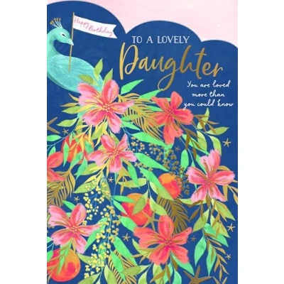 STUNNING BIRTHDAY CARD FOR A LOVELY DAUGHTER - this beautiful card is perfect for a wonderful daughter on her special day ORIGINAL ARTWORK - the pretty design features a peacock with a tail of colourful flowers, fruit and tropical leaves LOVING WORDS - the message on the front reads: 'To a lovely daughter. You are loved more than you could know' PREMIUM CARD MEASURES 6 X 9 INCHES (15 X 22 CMS) - printed on top quality card with a sturdy envelope included DESIGNED BY WISHING WELL STUDIOS - every Wishing Well card is lovingly made to delight. Our unique, high quality cards are created in the UK to mark any occasion