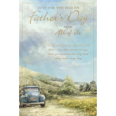 LOVELY FATHER'S DAY CARD FROM ALL OF US - Dad will be delighted to open this beautiful card especially designed to be sent from the whole family, whether that's brothers and sisters joining together to send a card, or a grown-up son or daughter sending a card from their family BEAUTIFUL ILLUSTRATION - the artwork shows a tranquil countryside scene, with a vintage car in the foreground. Gold foil lettering and a foiled border add a luxury touch AFFECTIONATE WORDS - cover message: 'Just for you Dad on Father's Day from all of us. You're really very special Dad, that's why this comes to say, that you deserve the very best today and every day.' Message on paper insert inside: 'May you find your special day brings joy right from the start, with memories of happiness forever in your heart. With love on Father's Day.' PREMIUM QUALITY CARD MEASURES 6X9 INCHES - this card is lovingly created by Wishing Well Studios, printed on high quality board and finished to a superb standard, with envelope included DESIGNED BY WISHING WELL STUDIOS - every Wishing Well card is designed to delight. Our unique, high-quality cards are created in the UK to mark every occasion, whatever the season.