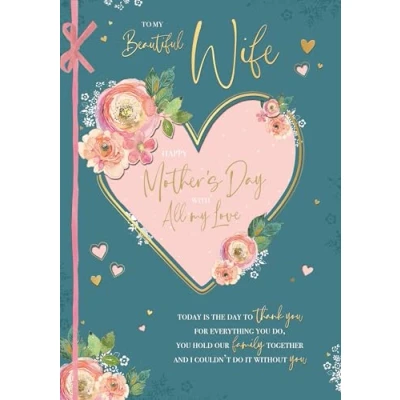 VINTAGE-STYLE HANDMADE MOTHER'S DAY CARD FOR YOUR WIFE - with floral motifs, diecut lovehearts and gold foil lettering, this pretty card is sure to be cherished by your wife as you celebrate Mother's Day HANDMADE TOUCHES - the card features a pink raffia ribbon on the front cover to give a luxurious finish, as well as three pages of verse inside LOVING VERSE - front cover verse 'To my beautiful wife...Today is the day to thank you for everything you do, you hold our family together and I couldn't do it without you' Inside pages 'So today I'm sending loving thoughts to you, because you are my wife and my whole world too. Relax, put your feet up and I'll sort out the rest, because today you get the day off and you deserve the best. Happy mother's day, with love.' PREMIUM CARD MEASURES 7 x 10 INS - this card is lovingly created by Wishing Well Studios, printed on high quality board and finished to a superb standard, with envelope included DESIGNED BY WISHING WELL STUDIOS - every Wishing Well card is designed to delight! Our unique, high quality cards are created in the UK to mark every occasion, whatever the season