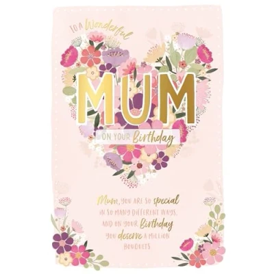 BEAUTIFUL BIRTHDAY CARD FOR MUM - this pretty card is perfect to send to a wonderful mum on her birthday ORIGINAL ARTWORK - the pretty design shows a heart shape filled with colourful flowers, overlaid with gold foil lettering LOVING WORDS - the message on the front reads: 'To a wonderful mum on your birthday. Mum, you are so special in so many different ways, and on your birthday you deserve a million bouquets' PREMIUM CARD MEASURES 6 X 9 INCHES (15 X 22 CMS) - printed on top quality card with a sturdy envelope included DESIGNED BY WISHING WELL STUDIOS - every Wishing Well card is lovingly made to delight. Our unique, high quality cards are created in the UK to mark any occasion