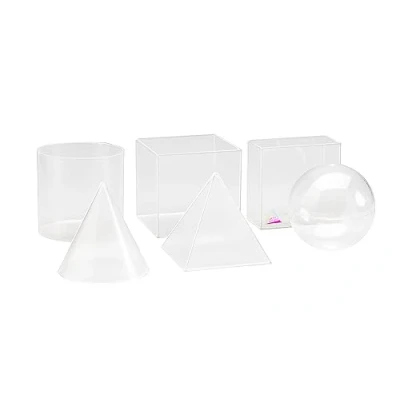 6 geometrical transparent bodies (cuboids, cubes, Cylinders, cones, pyramids and spheres) Getting to know the geometric bodies and their different volumes as well as training of the spatial imagination Packed in carton; Conforms to toy standard DIN EN71-3 Made of Re-Plastic (sustainable and 100% recycled) Made in Germany
