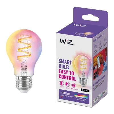 Smart controllable WiZ E27 LED drop bulb 6.3 W RGBW in decorative filament lookEven conventional luminaires that offer a glimpse of the socket can be smartly upgraded in a visually appealing way with this LED lamp. The A60 lamp in clear drop shape is equipped with LED filaments that provide warm white to daylight white light and also countless colourful gradations with dimmable brightness. These can be freely adjusted as desired or selected in the form of pre-configured scenes. All settings can be made via the app on the tablet/smartphone, and there are also options for control via remote control, voice command and smart home systems.Special features / compatibility:- over 64,000 shades of white (warm white to daylight) and 16 million coloured light colours can be set- can be integrated via WLAN; bridge or gateway are not necessary- can be controlled with the smartphone or tablet with WiZ app- can alternatively be controlled with WiZ remote control (see accessories)- voice control with Amazon Alexa, Apple HomeKit (Siri) or Google Assistant possible- various app functions: direct switching, dimming, dimmable brightness and dimmable scenes. App functions: direct switching and dimming; saving of popular scenes; assignment of lamps to rooms/groups; creation of schedules; selection of preset lighting modes/scenes; assignment of multiple users and assignment of access rights; operation of up to 10,000 WiZ lamps