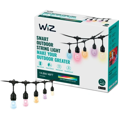 CurrysLight up your world with these smart WiZ string lights. With an IP55 rating, they're built to withstand Mother Nature in all her moods, making them ideal for your backyard. Choose from preset dynamic light modes like Ocean or Party to instantly transform your space. But what if you forgot to turn the lights off before leaving home? Just use the WiZ app to turn them off from wherever you are. Good to know - Enjoy hands-free commands by using Alexa or Google Assistant- Activate the SpaceSense feature with 2 or more WiZ lights and turn them into motion sensors - Adjust the brightness to your liking - from blindingly bright to soft, dimmed light - Schedule your lights to turn on at your preferred times and arrive home to a warm, welcoming glow