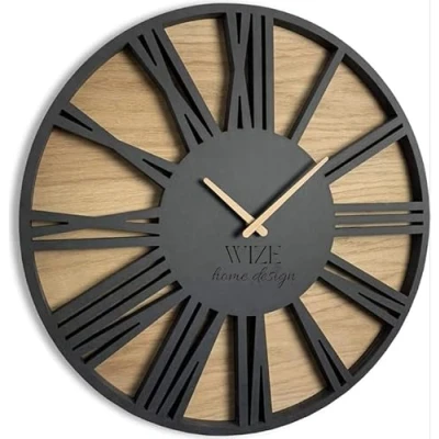 Wize Products Modern 19.7" Wooden Wall Clock Silent Movement Roman LOFT Round Clocks for Living Room Bedroom Decorative Kitchen Oak Black