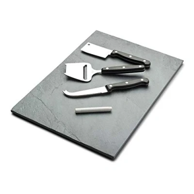 Premium quality stone cheese platter is ideal for serving cheese at the dining table. The black natural stone material creates a beautiful cheese board display. Attractive traditional design for cheese lovers. Serve cheddar, stilton, camembert, goats and many other cheeses in style. Serving board includes chalk so that you can mark the slate with your chosen artisan cheese names, a fun twist on a traditional presentation. With a good high-quality ergonomic cheese knife. Enjoy grapes, apples, figs and celery to cleanse the palate. High quality slate cheese serving board which is food safe, store safely, handwash and dry.