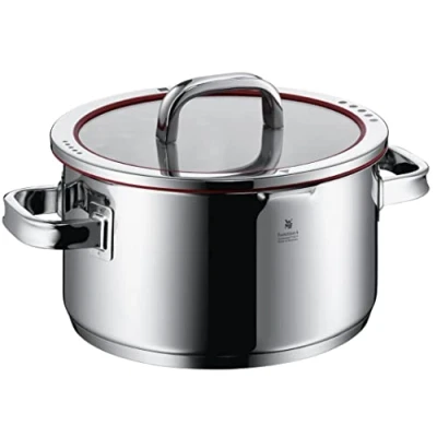 24cm High casserole with lid measures 13cm in height, holds a capacity of 5.7L Award winning innovative design made in Germany Made from polished Cromargan 18/10 stainless steel, high quality glass and red silicone Stay cool handles Dishwasher safe and suitable for all heat sources including induction