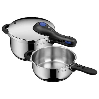 Contents: 1x pressure cooker volume 4.5 l, Ø 22 cm 1x pressure cooker volume 3 l, Ø 22 cm 1 x lid, Item number: 0794459990 Material: Cromargan 18/10 stainless steel, polished, rust-proof, dishwasher safe and acid-resistant; Except the sealing ring and removable lid handle, all parts are dishwasher safe TransTherm universal base suitable for all hob types, including induction for optimal heat distribution and retention that saves energy; flame protection on handle and handle Optimum safety thanks to the pin on the pressure indicator, this pin is the first thing to raise when cooking, indicates that the pot is already under pressure and the lid is completely locked Easy opening and closing, progressive release of pressure, by sliding buttons on the sides of the handle; the fixing system on the inside of the handle makes it more effective and easy to operate