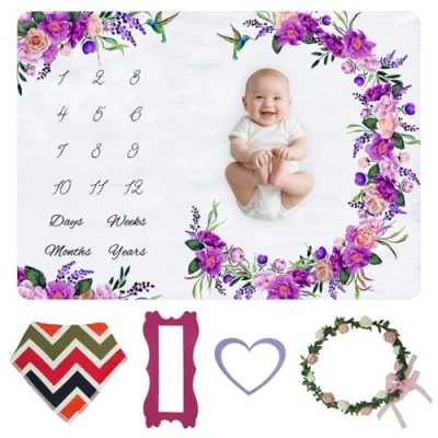 wocharm Baby Milestone Mat Blanket Photo Prop with Floral Numbers Newborn Boy Girl Gift(Purple)