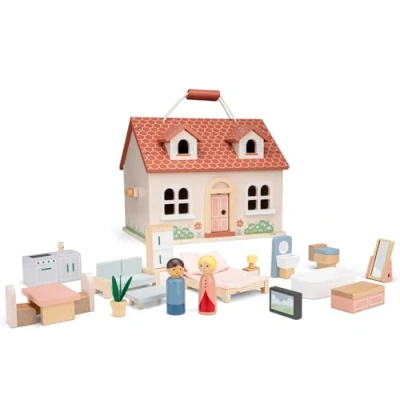 Woet Wooden Foldable Dollhouse for Kids Age 3+ Pretend Play Doll House with 18 Piece Furniture & 2 Dolls Portable Educational Role Toy Girls and Boys