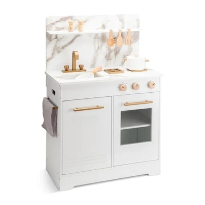 Woet Wooden White Play Kitchen for Kids Age 3+ Pretend Playset with Utensils, Cooking Accessories & Marble Details Childrens Role Toy Gift Boys and Girls