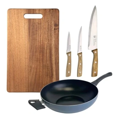 Complete your kitchen with the San Ignacio NOIA set, designed to offer style, functionality and comfort in every preparation. This practical set includes 3 stainless steel knives – chef (Ø20.2 cm), multipurpose (Ø11.6 cm) and peeler (Ø8.6 cm) – ideal for cutting, chopping and peeling all types of food with precision. It also incorporates a Wok of Ø30 cm, made of pressed aluminium for even and efficient cooking, with high-quality non-stick coating and ergonomic handles, suitable for all types of cookers, including induction. To complete, the set includes a 40 x 25 x 1.5 cm cutting board in durable acacia wood, combining elegance and functionality to prepare your food with comfort and style. A complete and versatile set, perfect for chefs, cooking lovers or as a practical and elegant gift, which brings quality, durability and design to your everyday culinary.